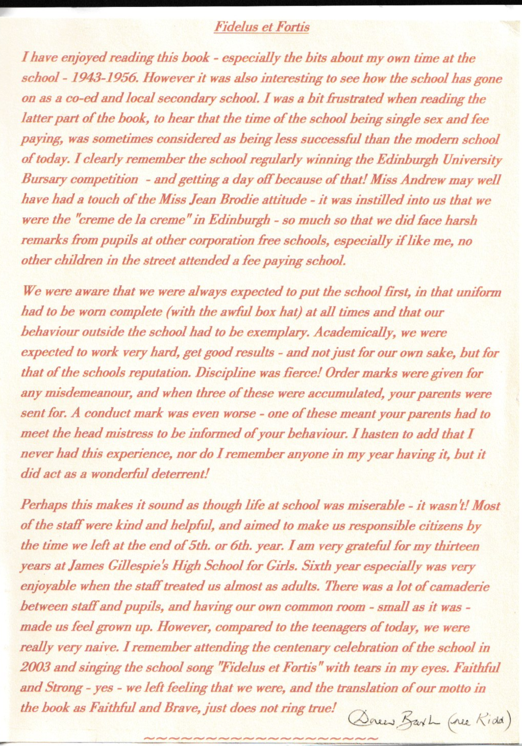 This book was commissioned to mark the opening of the new school in 2015/16. Most Gillespie students remember ‘Fidelis et Fortis’ as ‘Faithful and Strong’ but the author of the book, John MacLeod, chose to call it ‘Faithful and Brave’. Doreen Baxter (Kidd) wrote about her thoughts on the book and they reflect the feelings of many former pupils. Doreen’s thoughts on ‘Fidelis et Fortis’.
